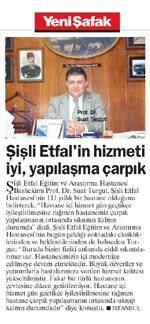 Şişli Etfal Eğitim ve Araştırma Hastanesi Başhekimi Prof. Dr. Suat Turgut, Şişli Etfal Hastanesi'nin 111 yıllık bir hastane olduğunu belirterek, 'Hastane içi hizmet gün geçtikçe iyileştirilmesine rağmen hastanemiz çarpık yapılaşmanın ortasında sıkışmış kalmış durumda' dedi. Şişli Etfal Eğitim ve Araştırma Hastanesi'nin bugün geldiği noktadaki eksikliklerinden ve beklentilerinden de bahseden Turgut; 'Burada bizim fiziki anlamda ciddi sıkıntılarımız var. Hastanesimizin içi modernize edilmeye devam etmektedir. Büyük özveriler ve yatırımlarla hastalarımıza verilen hizmet kalitesi yükseltilmiştir. Fakat bir türlü hastanenin çevresine düzen getirilemiyor. Hastane içi hizmet gün geçtikçe iyileştirilmesine rağmen hastane çarpık yapılaşmanın ortasında sıkışıp kalmış durumdadır' diye konuştu.