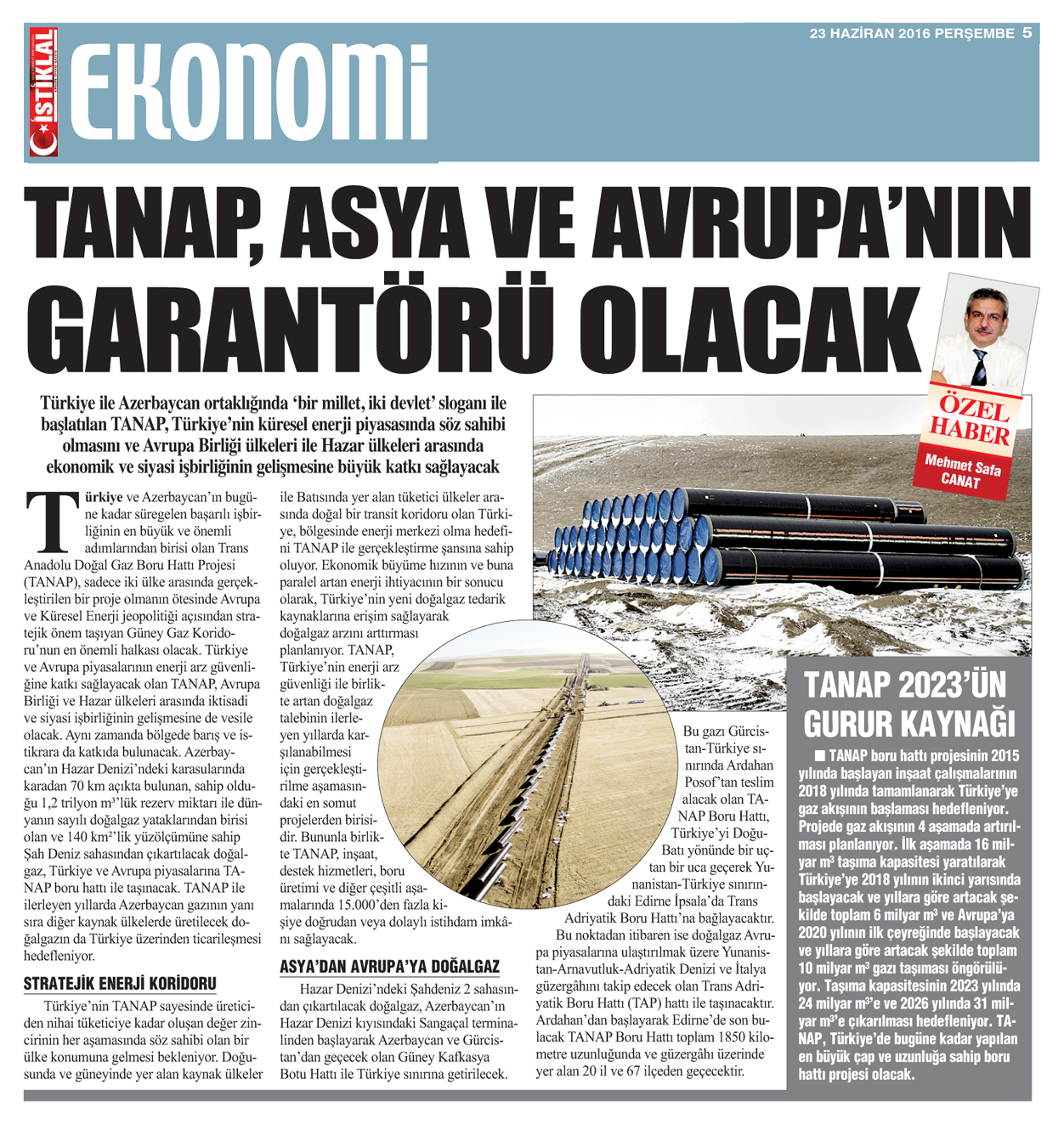 TANAP, Asya ve Avrupa'nın garantörü olacak İstiklal Gazetesi / 23.06.2016 TANAP, Türkiye'nin küresel enerji piyasasında söz sahibi olmasını ve Avrupa Birliği ülkeleri ile Hazar ülkeleri arasında ekonomik ve siyasi işbirliğinin gelişmesine büyük katkı sağlayacak. Türkiye ile Azerbaycan ortaklığında 'bir millet, iki devlet' sloganı ile başlatılan TANAP, Türkiye'nin küresel enerji piyasasında söz sahibi olmasını ve Avrupa Birliği ülkeleri ile Hazar ülkeleri arasında ekonomik ve siyasi işbirliğinin gelişmesine büyük katkı sağlayacak. Türkiye ve Azerbaycan'ın bugüne kadar süregelen başarılı işbirliğinin en büyük ve önemli adımlarından birisi olan Trans Anadolu Doğal Gaz Boru Hattı Projesi (TANAP), sadece iki ülke arasında gerçekleştirilen bir proje olmanın ötesinde Avrupa ve Küresel Enerji jeopolitiği açısından stratejik önem taşıyan Güney Gaz Koridoru'nun en önemli halkası olacak. Türkiye ve Avrupa piyasalarının enerji arz güvenliğine katkı sağlayacak olan TANAP, Avrupa Birliği ve Hazar ülkeleri arasında iktisadi ve siyasi işbirliğinin gelişmesine de vesile olacak. Aynı zamanda bölgede barış ve istikrara da katkıda bulunacak. Azerbaycan'ın Hazar Denizi'ndeki karasularında karadan 70 km açıkta bulunan, sahip olduğu 1,2 trilyon m³'lük rezerv miktarı ile dünyanın sayılı doğalgaz yataklarından birisi olan ve 140 km²'lik yüzölçümüne sahip Şah Deniz sahasından çıkartılacak doğalgaz, Türkiye ve Avrupa piyasalarına TANAP boru hattı ile taşınacak. TANAP ile ilerleyen yıllarda Azerbaycan gazının yanı sıra diğer kaynak ülkelerde üretilecek doğalgazın da Türkiye üzerinden ticarileşmesi hedefleniyor. STRATEJİK ENERJİ KORİDORU Türkiye'nin TANAP sayesinde üreticiden nihai tüketiciye kadar oluşan değer zincirinin her aşamasında söz sahibi olan bir ülke konumuna gelmesi bekleniyor. Doğusunda ve güneyinde yer alan kaynak ülkeler ile Batısında yer alan tüketici ülkeler arasında doğal bir transit koridoru olan Türkiye, bölgesinde enerji merkezi olma hedefini TANAP ile gerçekleştirme şansına sahip oluyor. Ekonomik büyüme hızının ve buna paralel artan enerji ihtiyacının bir sonucu olarak, Türkiye'nin yeni doğalgaz tedarik kaynaklarına erişim sağlayarak doğalgaz arzını arttırması planlanıyor. TANAP, Türkiye'nin enerji arz güvenliği ile birlikte artan doğalgaz talebinin ilerleyen yıllarda karşılanabilmesi için gerçekleştirilme aşamasındaki en somut projelerden birisidir. Bununla birlikte TANAP, inşaat, destek hizmetleri, boru üretimi ve diğer çeşitli aşamalarında 15.000'den fazla kişiye doğrudan veya dolaylı istihdam imkânı sağlayacak. ASYA'DAN AVRUPA'YA DOĞALGAZ Hazar Denizi'ndeki Şahdeniz 2 sahasından çıkartılacak doğalgaz, Azerbaycan'ın Hazar Denizi kıyısındaki Sangaçal terminalinden başlayarak Azerbaycan ve Gürcistan'dan geçecek olan Güney Kafkasya Botu Hattı ile Türkiye sınırına getirilecek. Bu gazı Gürcistan-Türkiye sınırında Ardahan Posof'tan teslim alacak olan TANAP Boru Hattı, Türkiye'yi Doğu-Batı yönünde bir uçtan bir uca geçerek Yunanistan-Türkiye sınırındaki Edirne İpsala'da Trans Adriyatik Boru Hattı'na bağlayacaktır. Bu noktadan itibaren ise doğalgaz Avrupa piyasalarına ulaştırılmak üzere Yunanistan-Arnavutluk-Adriyatik Denizi ve İtalya güzergâhını takip edecek olan Trans Adriyatik Boru Hattı (TAP) hattı ile taşınacaktır. Ardahan'dan başlayarak Edirne'de son bulacak TANAP Boru Hattı toplam 1850 kilometre uzunluğunda ve güzergâhı üzerinde yer alan 20 il ve 67 ilçeden geçecektir. TANAP 2023'ÜN GURUR KAYNAĞI TANAP boru hattı projesinin 2015 yılında başlayan inşaat çalışmalarının 2018 yılında tamamlanarak Türkiye'ye gaz akışının başlaması hedefleniyor. Projede gaz akışının 4 aşamada artırılması planlanıyor. İlk aşamada 16 milyar m³ taşıma kapasitesi yaratılarak Türkiye'ye 2018 yılının ikinci yarısında başlayacak ve yıllara göre artacak şekilde toplam 6 milyar m³ ve Avrupa'ya 2020 yılının ilk çeyreğinde başlayacak ve yıllara göre artacak şekilde toplam 10 milyar m³ gazı taşıması öngörülüyor. Taşıma kapasitesinin 2023 yılında 24 milyar m³'e ve 2026 yılında 31 milyar m³'e çıkarılması hedefleniyor. TANAP, Türkiye'de bugüne kadar yapılan en büyük çap ve uzunluğa sahip boru hattı projesi olacak. MEHMET SAFA CANAT - HASAN CANAT / İSTANBUL |