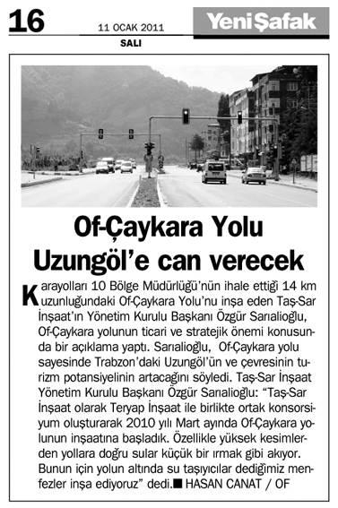 Karayolları 10 Bölge Müdürlüğü'nün ihale ettiği 14 km uzunluğundaki Of-Çaykara Yolu'nu inşa eden Taş-Sar İnşaat'ın Yönetim Kurulu Başkanı Özgür Sarıalioğlu, Of-Çaykara yolunun ticari ve stratejik önemi konusunda bir açıklama yaptı.