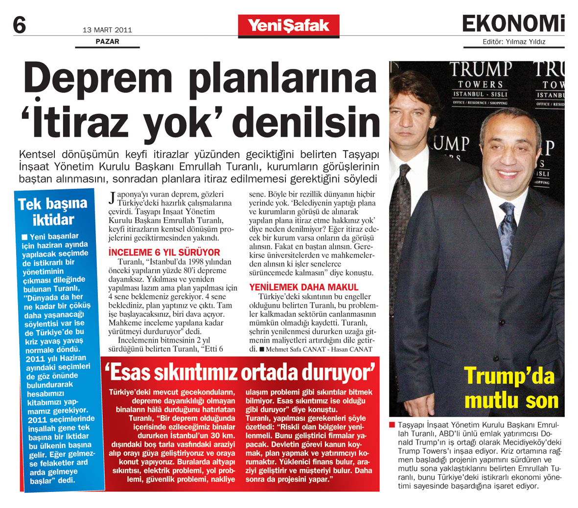 Taşyapı İnşaat Yönetim Kurulu Başkanı Emrullah Turanlı, ABD'li ünlü emlak yatırımcısı Donald Trump'ın iş ortağı olarak Mecidiyeköy'deki Trump Towers'ı inşaa ediyor. Kriz ortamına rağmen başladığı projenin yapımını sürdüren ve mutlu sona yaklaştıklarını belirten Emrullah Turanlı, bunu Türkiye'deki istikrarlı ekonomi yönetimi sayesinde başardığına işaret ediyor.