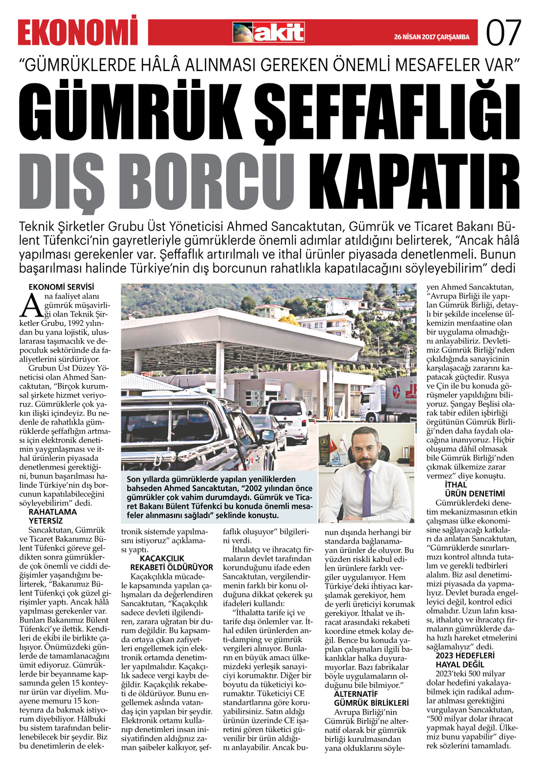 Teknik Şirketler Gurubu Üst Yöneticisi Ahmed Sancaktutan, Gümrük ve Ticaret Bakanı Bülent Tüfenkçi'nin gayretleriyle gümrüklerde önemli adımlar atıldığını belirterek, "Ancak hâlâ yapılması gerekenler var. Şeffaflık arttırılmalı ve ithal ürünler piyasada denetlenmeli. Bunun başarılması halinde Türkiye'nin dış borcunun rahatlıkla kapatılacağını söyleyebilirim" dedi.