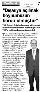 TOKİ Başkanı Erdoğan Bayraktar, TOKİ'nin başarısında Türk halkının güven ve teveccühünün en büyük etken olduğunu belirtirken, tecrübelerini yurtdışına taşıyacaklarını söyledi. İdeallerinin Türkiye'de bir tek gecekondu bile kalmaması olduğunu dile getiren Bayraktar, '2011 yılında kentsel dönüşüm projesi ile 500 bin konut hedefimize ulaşmak istiyoruz. Türk halkının TOKİ'ye olan güven ve teveccühü başarılarımızın en büyük etkeni olmuştur. Biz artık bu saatten sonra kendimizi aşmak zorundayız' dedi.