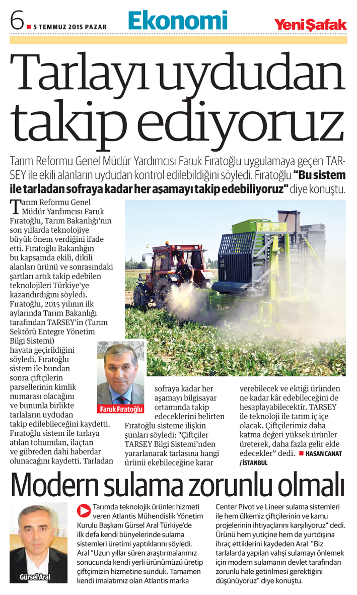 Tarımda teknolojik ürünler hizmeti veren Atlantis Mühendislik Yönetim Kurulu Başkanı Gürsel Aral Türkiye'de ilk defa kendi bünyelerinde sulama sistemleri üretimi yaptıklarını söyledi. Aral "Uzun yıllar süren araştırmalarımız sonucunda kendi yerli ürünümüzü üretip çiftçimizin hizmetine sunduk. Tamamen kendi imalatımız olan Atlantis marka Center Pivot ve Lineer sulama sistemleri ile hem ülkemiz çiftçilerinin ve kamu projelerinin ihtiyaçlarını karşılıyoruz" dedi. Ürünü hem yutiçine hem de yurtdışına ihraç ettiklerini kaydeden Aral "Biz tarlalarda yapılan vahşi sulamayı önlemek için modern sulamanın devlet tarafından zorunlu hale getirilmesi gerektiğini düşünüyoruz" diye konuştu.