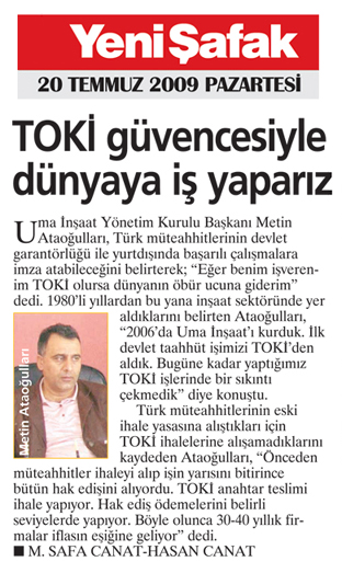 1980'li yıllardan bu yana inşaat sektöründe yer aldıklarını belirten Ataoğulları, '2006'da Uma İnşaat'ı kurduk. İlk devlet taahhüt işimizi TOKİ'den aldık. Bugüne kadar yaptığımız TOKİ işlerinde bir sıkıntı çekmedik' diye konuştu.