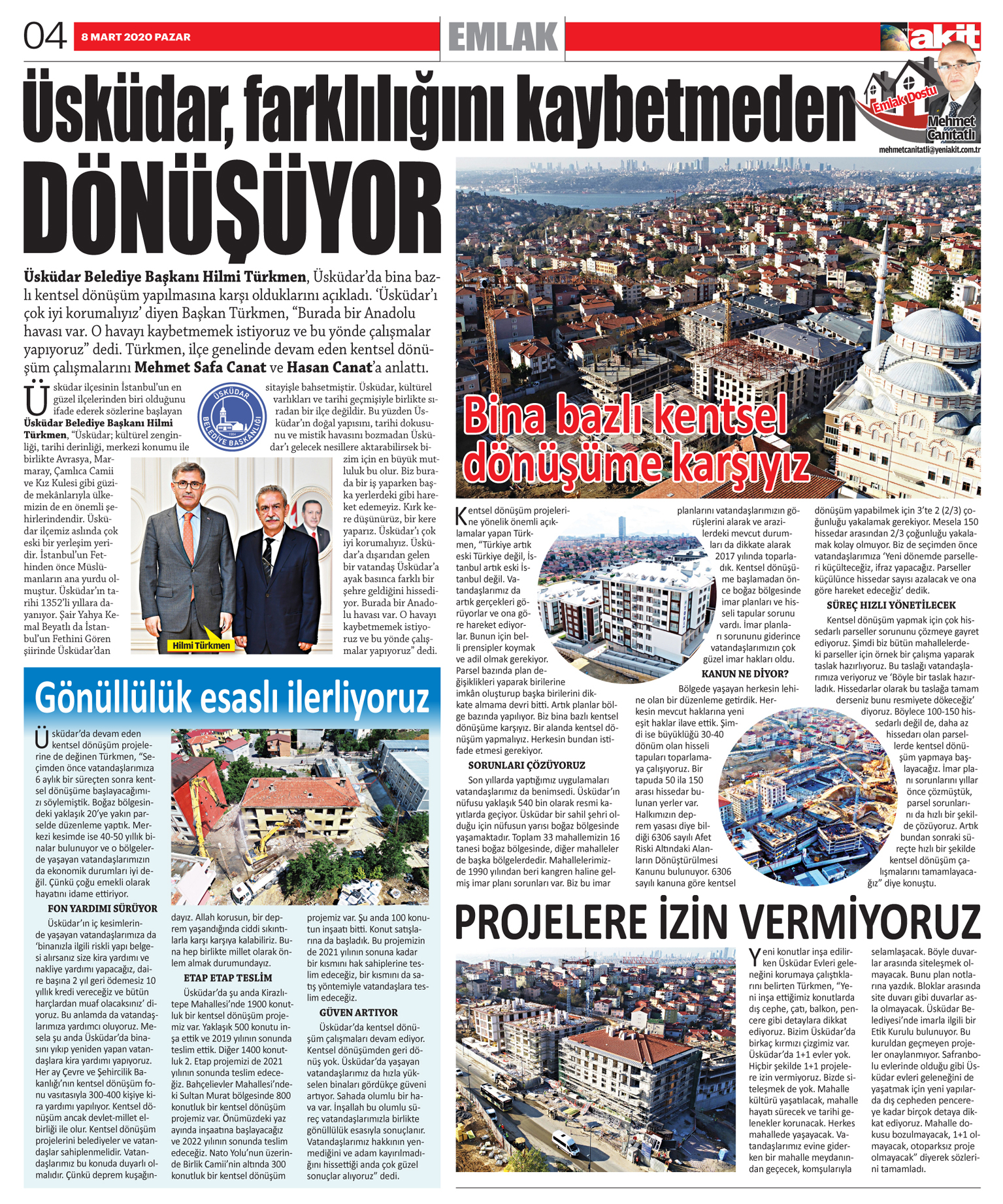 Üsküdar, farklılığını kaybetmeden dönüşüyor Yeni Akit Gazetesi / 08.03.2020 Üsküdar Belediye Başkanı Hilmi Türkmen, Üsküdar'da bina bazlı kentsel dönüşüm yapılmasına karşı olduklarını açıkladı. 'Üsküdar'ı çok iyi korumalıyız' diyen Başkan Türkmen, "Burada bir Anadolu havası var. O havayı kaybetmemek istiyoruz ve bu yönde çalışmalar yapıyoruz" dedi. Türkmen, ilçe genelinde devam eden kentsel dönüşüm çalışmalarını Mehmet Safa Canat ve Hasan Canat'a anlattı. Üsküdar ilçesinin İstanbul'un en güzel ilçelerinden biri olduğunu ifade ederek sözlerine başlayan Üsküdar Belediye Başkanı Hilmi Türkmen, "Üsküdar; kültürel zenginliği, tarihi derinliği, merkezi konumu ile birlikte Avrasya, Marmaray, Çamlıca Camii ve Kız Kulesi gibi güzide mekânlarıyla ülkemizin de en önemli şehirlerindendir. Üsküdar ilçemiz aslında çok eski bir yerleşim yeridir. İstanbul'un Fethinden önce Müslümanların ana yurdu olmuştur. Üsküdar'ın tarihi 1352'li yıllara dayanıyor. Şair Yahya Kemal Beyatlı da İstanbul'un Fethini Gören şiirinde Üsküdar'dan sitayişle bahsetmiştir. Üsküdar, kültürel varlıkları ve tarihi geçmişiyle birlikte sıradan bir ilçe değildir. Bu yüzden Üsküdar'ın doğal yapısını, tarihi dokusunu ve mistik havasını bozmadan Üsküdar'ı gelecek nesillere aktarabilirsek bizim için en büyük mutluluk bu olur. Biz burada bir iş yaparken başka yerlerdeki gibi hareket edemeyiz. Kırk kere düşünürüz, bir kere yaparız. Üsküdar'ı çok iyi korumalıyız. Üsküdar'a dışarıdan gelen bir vatandaş Üsküdar'a ayak basınca farklı bir şehre geldiğini hissediyor. Burada bir Anadolu havası var. O havayı kaybetmemek istiyoruz ve bu yönde çalışmalar yapıyoruz" dedi. Gönüllülük esaslı ilerliyoruz Üsküdar'da devam eden kentsel dönüşüm projelerine de değinen Türkmen, "Seçimden önce vatandaşlarımıza 6 aylık bir süreçten sonra kentsel dönüşüme başlayacağımızı söylemiştik. Boğaz bölgesindeki yaklaşık 20'ye yakın parselde düzenleme yaptık. Merkezi kesimde ise 40-50 yıllık binalar bulunuyor ve o bölgelerde yaşayan vatandaşlarımızın da ekonomik durumları iyi değil. Çünkü çoğu emekli olarak hayatını idame ettiriyor. Fon yardımı sürüyor Üsküdar'ın iç kesimlerinde yaşayan vatandaşlarımıza da 'binanızla ilgili riskli yapı belgesi alırsanız size kira yardımı ve nakliye yardımı yapacağız, daire başına 2 yıl geri ödemesiz 10 yıllık kredi vereceğiz ve bütün harçlardan muaf olacaksınız' diyoruz. Bu anlamda da vatandaşlarımıza yardımcı oluyoruz. Mesela şu anda Üsküdar'da binasını yıkıp yeniden yapan vatandaşlara kira yardımı yapıyoruz. Her ay Çevre ve Şehircilik Bakanlığı'nın kentsel dönüşüm fonu vasıtasıyla 300-400 kişiye kira yardımı yapılıyor. Kentsel dönüşüm ancak devlet-millet elbirliği ile olur. Kentsel dönüşüm projelerini belediyeler ve vatandaşlar sahiplenmelidir. Vatandaşlarımız bu konuda duyarlı olmalıdır. Çünkü deprem kuşağındayız. Allah korusun, bir deprem yaşandığında ciddi sıkıntılarla karşı karşıya kalabiliriz. Buna hep birlikte millet olarak önlem almak durumundayız. Etap etap teslim Üsküdar'da şu anda Kirazlıtepe Mahallesi'nde 1900 konutluk bir kentsel dönüşüm projemiz var. Yaklaşık 500 konutu inşa ettik ve 2019 yılının sonunda teslim ettik. Diğer 1400 konutluk 2. Etap projemizi de 2021 yılının sonunda teslim edeceğiz. Bahçelievler Mahallesi'ndeki Sultan Murat bölgesinde 800 konutluk bir kentsel dönüşüm projemiz var. Önümüzdeki yaz ayında inşaatına başlayacağız ve 2022 yılının sonunda teslim edeceğiz. Nato Yolu'nun üzerinde Birlik Camii'nin altında 300 konutluk bir kentsel dönüşüm projemiz var. Şu anda 100 konutun inşaatı bitti. Konut satışlarına da başladık. Bu projemizin de 2021 yılının sonuna kadar bir kısmını hak sahiplerine teslim edeceğiz, bir kısmını da satış yöntemiyle vatandaşlara teslim edeceğiz. Güven artıyor Üsküdar'da kentsel dönüşüm çalışmaları devam ediyor. Kentsel dönüşümden geri dönüş yok. Üsküdar'da yaşayan vatandaşlarımız da hızla yükselen binaları gördükçe güveni artıyor. Sahada olumlu bir hava var. İnşallah bu olumlu süreç vatandaşlarımızla birlikte gönüllülük esasıyla sonuçlanır. Vatandaşlarımız hakkının yenmediğini ve adam kayırılmadığını hissettiği anda çok güzel sonuçlar alıyoruz" dedi. Bina bazlı kentsel dönüşüme karşıyız Kentsel dönüşüm projelerine yönelik önemli açıklamalar yapan Türkmen, "Türkiye artık eski Türkiye değil, İstanbul artık eski İstanbul değil. Vatandaşlarımız da artık gerçekleri görüyorlar ve ona göre hareket ediyorlar. Bunun için belli prensipler koymak ve adil olmak gerekiyor. Parsel bazında plan değişiklikleri yaparak birilerine imkân oluşturup başka birilerini dikkate almama devri bitti. Artık planlar bölge bazında yapılıyor. Biz bina bazlı kentsel dönüşüme karşıyız. Bir alanda kentsel dönüşüm yapmalıyız. Herkesin bundan istifade etmesi gerekiyor. Sorunları çözüyoruz Son yıllarda yaptığımız uygulamaları vatandaşlarımız da benimsedi. Üsküdar'ın nüfusu yaklaşık 540 bin olarak resmi kayıtlarda geçiyor. Üsküdar bir sahil şehri olduğu için nüfusun yarısı boğaz bölgesinde yaşamaktadır. Toplam 33 mahallemizin 16 tanesi boğaz bölgesinde, diğer mahalleler de başka bölgelerdedir. Mahallelerimizde 1990 yılından beri kangren haline gelmiş imar planı sorunları var. Biz bu imar planlarını vatandaşlarımızın görüşlerini alarak ve arazilerdeki mevcut durumları da dikkate alarak 2017 yılında toparladık. Kentsel dönüşüme başlamadan önce boğaz bölgesinde imar planları ve hisseli tapular sorunu vardı. İmar planları sorununu giderince vatanda