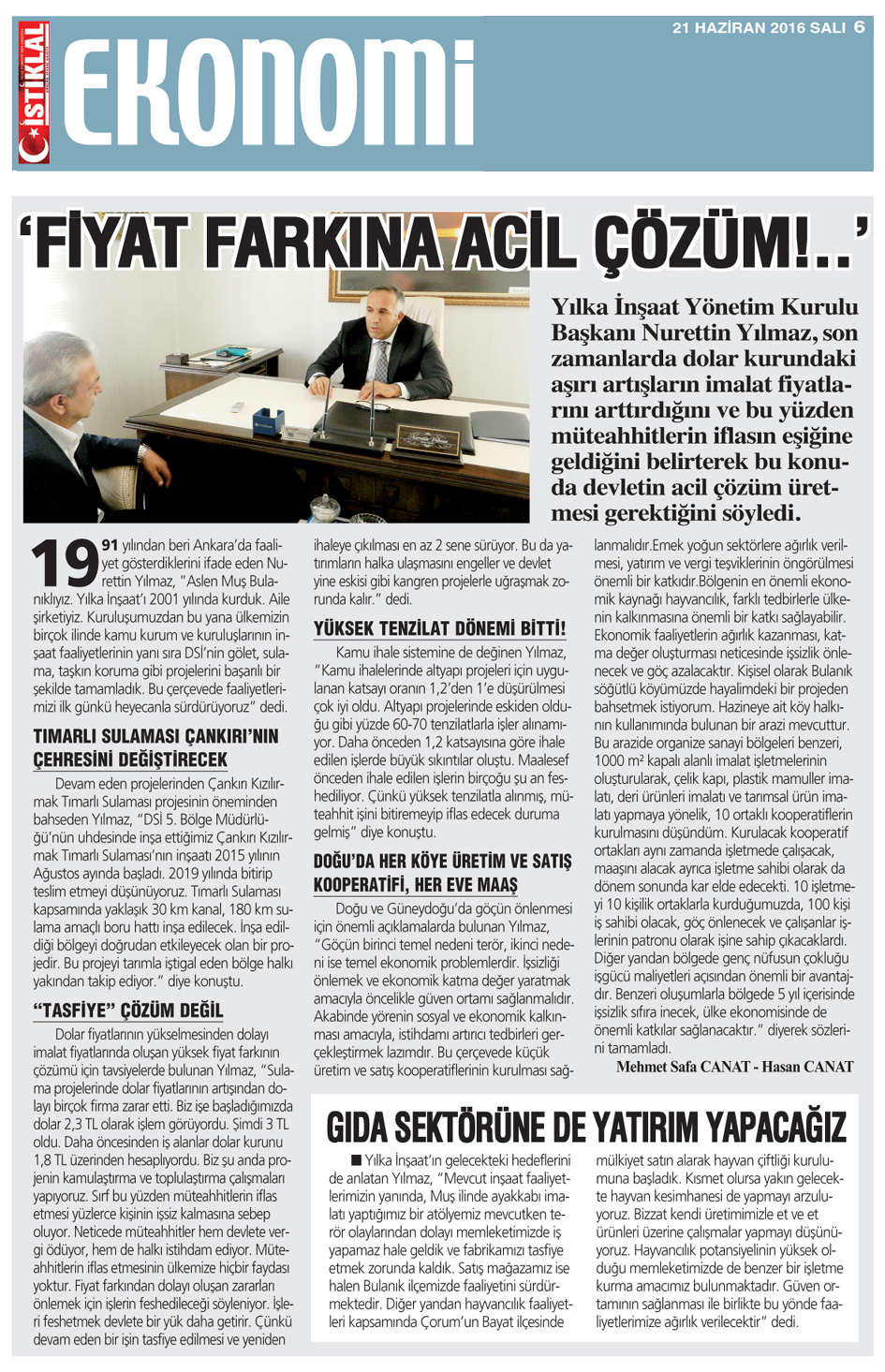 Fiyat farkına acil çözüm İstiklal Gazetesi / 21.06.2016 Yılka İnşaat Yönetim Kurulu Başkanı Nurettin Yılmaz, dolar kurundaki aşırı artışların imalat fiyatlarını arttırdığını ve bu yüzden müteahhitlerin iflasın eşiğine geldiğini belirterek bu konuda devletin acil çözüm üretmesi gerektiğini söyledi. 1991 yılından beri Ankara'da faaliyet gösterdiklerini ifade eden Nurettin Yılmaz, "Aslen Muş Bulanıklıyız. Yılka İnşaat'ı 2001 yılında kurduk. Aile şirketiyiz. Kuruluşumuzdan bu yana ülkemizin birçok ilinde kamu kurum ve kuruluşlarının inşaat faaliyetlerinin yanı sıra DSİ'nin gölet, sulama, taşkın koruma gibi projelerini başarılı bir şekilde tamamladık. Bu çerçevede faaliyetlerimizi ilk günkü heyecanla sürdürüyoruz" dedi. TIMARLI SULAMASI ÇANKIRI'NIN ÇEHRESİNİ DEĞİŞTİRECEK Devam eden projelerinden Çankırı Kızılırmak Tımarlı Sulaması projesinin öneminden bahseden Yılmaz, "DSİ 5. Bölge Müdürlüğü'nün uhdesinde inşa ettiğimiz Çankırı Kızılırmak Tımarlı Sulaması'nın inşaatı 2015 yılının Ağustos ayında başladı. 2019 yılında bitirip teslim etmeyi düşünüyoruz. Tımarlı Sulaması kapsamında yaklaşık 30 km kanal, 180 km sulama amaçlı boru hattı inşa edilecek. İnşa edildiği bölgeyi doğrudan etkileyecek olan bir projedir. Bu projeyi tarımla iştigal eden bölge halkı yakından takip ediyor. Proje bittiği zaman yaklaşık 8 bin hektar arazinin sulamaya açılacak olması, tarımsal üretimin önemli ölçüde artmasına neden olacaktır" diye konuştu. "TASFİYE" ÇÖZÜM DEĞİL Dolar fiyatlarının yükselmesinden dolayı imalat fiyatlarında oluşan yüksek fiyat farkının çözümü için tavsiyelerde bulunan Yılmaz, "Sulama projelerinde dolar fiyatlarının artışından dolayı birçok firma zarar etti. Biz işe başladığımızda dolar 2,3 TL olarak işlem görüyordu. Şimdi 3 TL oldu. Daha öncesinden iş alanlar dolar kurunu 1,8 TL üzerinden hesaplıyordu. Biz şu anda projenin kamulaştırma ve toplulaştırma çalışmaları yapıyoruz. 2017 yılında boruları döşemeye başlayacağız. Bizim de temennimiz, herkesin umut ettiği gibi dolar artışından kaynaklanan fiyat farkının makul bir çözüme kavuşturulmasıdır. Sırf bu yüzden müteahhitlerin iflas etmesi yüzlerce kişinin işsiz kalmasına sebep oluyor. Neticede müteahhitler hem devlete vergi ödüyor, hem de halkı istihdam ediyor. Müteahhitlerin iflas etmesinin ülkemize hiçbir faydası yoktur. Fiyat farkından dolayı oluşan zararları önlemek için işlerin feshedileceği söyleniyor. İşleri feshetmek devlete bir yük daha getirir. Çünkü devam eden bir işin tasfiye edilmesi ve yeniden ihaleye çıkılması en az 2 sene sürüyor. Bu da yatırımların halka ulaşmasını engeller ve devlet yine eskisi gibi kangren projelerle uğraşmak zorunda kalır. Dolayısıyla işlerin tasfiye edilmeden hızlı bir şekilde bitirilmesi hem devletimizin hem de milletimizin menfaatinedir" dedi. YÜKSEK TENZİLAT DÖNEMİ BİTTİ! Kamu ihale sistemine de değinen Yılmaz, "Kamu ihalelerinde altyapı projeleri için uygulanan katsayı oranın 1,2'den 1'e düşürülmesi çok iyi oldu. Altyapı projelerinde eskiden olduğu gibi yüzde 60-70 tenzilatlarla işler alınamıyor. Daha önceden 1,2 katsayısına göre ihale edilen işlerde büyük sıkıntılar oluştu. Maalesef önceden ihale edilen işlerin birçoğu şu an feshediliyor. Çünkü yüksek tenzilatla alınmış, müteahhit işini bitiremeyip iflas edecek duruma gelmiş" diye konuştu. GIDA SEKTÖRÜNE DE YATIRIM YAPACAĞIZ Yılka İnşaat'ın gelecekteki hedeflerini de anlatan Yılmaz, "Mevcut inşaat faaliyetlerimizin yanında, Muş ilinde ayakkabı imalatı yaptığımız bir atölyemiz mevcutken terör olaylarından dolayı memleketimizde iş yapamaz hale geldik ve fabrikamızı tasfiye etmek zorunda kaldık. Satış mağazamız ise halen Bulanık ilçemizde faaliyetini sürdürmektedir. Diğer yandan hayvancılık faaliyetleri kapsamında Çorum'un Bayat ilçesinde mülkiyet satın alarak hayvan çiftliği kurulumuna başladık. Kısmet olursa yakın gelecekte hayvan kesimhanesi de yapmayı arzuluyoruz. Bizzat kendi üretimimizle et ve et ürünleri üzerine çalışmalar yapmayı düşünüyoruz. Hayvancılık potansiyelinin yüksek olduğu memleketimizde de benzer bir işletme kurma amacımız bulunmaktadır. Güven ortamının sağlanması ile birlikte bu yönde faaliyetlerimize ağırlık verilecektir" dedi. DOĞU'DA HER KÖYE ÜRETİM VE SATIŞ KOOPERATİFİ, HER EVE MAAŞ Doğu ve Güneydoğu'da göçün önlenmesi için önemli açıklamalarda bulunan Yılmaz, "Göçün birinci temel nedeni terör, ikinci nedeni ise temel ekonomik problemlerdir. Ekonomik nedenlerin başında işsizlik gelmektedir. İşsizliği önlemek ve ekonomik katma değer yaratmak amacıyla öncelikle güven ortamı sağlanmalıdır. Akabinde yörenin sosyal ve ekonomik kalkınması amacıyla, istihdamı artırıcı tedbirleri gerçekleştirmek lazımdır. Bu çerçevede küçük üretim ve satış kooperatiflerinin kurulması sağlanmalıdır. Devlet teşvikleriyle bölgesel üretim ve satış kooperatifleri, bölgesel pazarların kurulması, istihdamın artmasına neden olacaktır. Doğu ve Güneydoğu'daki her ilçede benzer oluşumların önünü açmak gerekir. Farklı sektörlerde ara mallar üreten küçük işletmelerin, kooperatiflerin kurulması bölgeye önemli ekonomik hareketlilik kazandıracaktır. Emek yoğun sektörlere ağırlık verilmesi, yatırım ve vergi teşviklerinin öngörülmesi önemli bir katkıdır. Gıda, temizlik ürünleri, giyim, dekorasyon malzemeleri ve daha birçok ürün üzerine küçük üretim sahaları oluşturabilir. Bölgenin en önemli ekonomik kaynağı hayvancılık, farklı tedbirlerle ülkenin kalkınmasına önemli bir katkı sağlayabilir. Kurulan üretim ve satış kooperatifleri vasıtas
