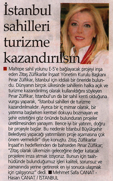 Dünyanın birçok ülkesinde sahillerin halka açık ve turizme kazandırılmış olarak kullanıldığını söyleyen Pınar Zülfikar, İstanbul'un da bir sahil kenti olduğuna vurgu yaparak, 'İstanbul sahilleri de turizme kazandırılmalıdır. Ayrıca bir iç mimar olarak, bir yatırıma başlarken kentsel dokuyu bozmayan ve şehir estetiğini göz önünde bulunduran projeler üretilmesinden yanayım. Bence iyi bir yatırım, doğru bir projeyle başlar. Bu nedenle İstanbul Büyükşehir Belediyesi yapacağı yatırımların proje aşamasına çok önem vermelidir' diye konuştu. Zitaş Zülfikarlar İnşaat'ın hedeflerinden de bahseden Pınar Zülfikar; 'Zitaş olarak ülkemizin geleceğine değer katacak projelere imza atmak istiyoruz. Bunun için taahhüdünde bulunduğumuz işleri kaliteli, sorunsuz ve zamanında yerine getirerek en iyi sonuca ulaşmak için çalışıyoruz' dedi.